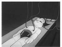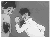事故をおこして死んでしまう所はらアニメ『鉄腕アトム」はスタートする。 息子の死を乗り越えるため代わりとなるロボットの製作を決断し1年後についに完成させた(名はトビオ) そして息子のように愛し育てるが、いつまでたっても成長しないトビオに腹をたて遂にはロボットサーカスに売り飛ばしてしまう。時代背景ではロボット製造は日常茶飯事で人間のためにあらゆるロボットが作られていたようである。そしてトビオは名を「アトム」と付けられロボット相手に決闘させられるのだが10万馬力のアトムが負ける訳はなく反対に負けた相手にとどめを刺せない優しい心のアトムなのだった。 それを見ていた新しく科学技術庁長官になった「お茶の水博士」はサーカスの団長にアトムを返してくれる様に頼むが断られてしまう。それどころかそんなアトムに団長はエネルギー補給をストップしてしまう、 そんな中サーカス開催中に火災が発生した、逃げまどう観客を救うためロボットたちは懸命に救助活動するのだが....。 |